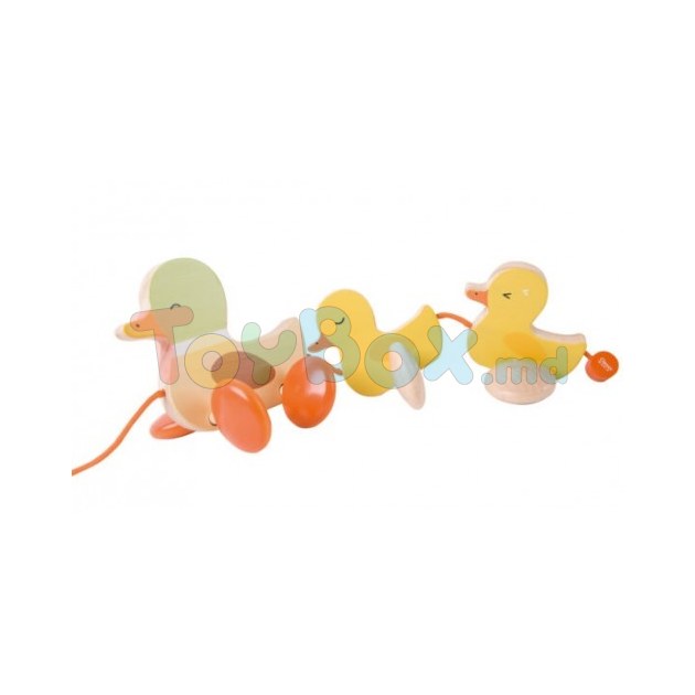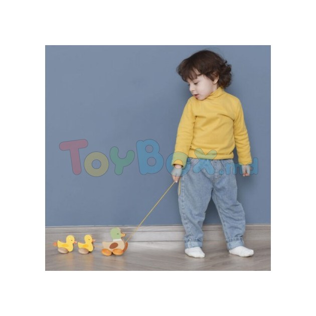 Смотрите, мама-утка и маленькие утята веселятся в воде. На всех есть купальные костюмы. Когда вы их тянете, колеса заставляют их покачиваться, как будто они плавают.