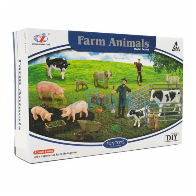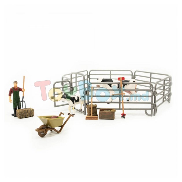 В комплект входит: складной забор, фермер, 2 коровы, 3 поросёнка, 2 овечки, метла, виллы, сено,тачка, овощи.