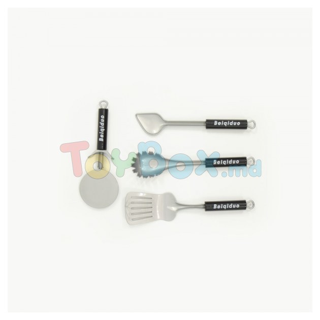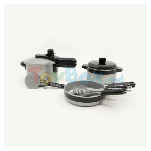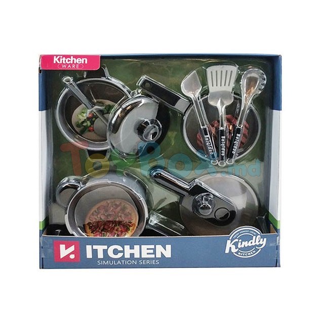 Кухонный набор, который включает в себя: кастрюля, сковорода, набор столовых приборов.
